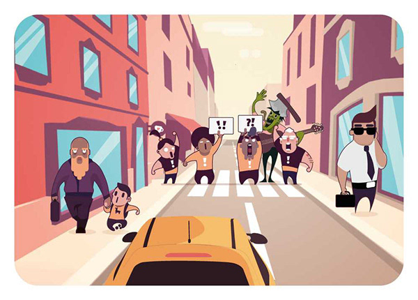 Crazy Pilot is a small, fast and quick-to-learn game I illustrated for Helvetiq. You play a not-so-careful driver rushing through the city, where every street hides something absurd: ghosts, pirates, zombies, random obstacles… The goal is simple: react faster than the others to what you see on the cards.