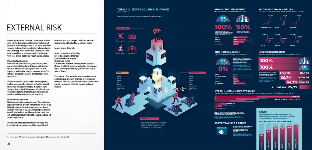 The illustrations showcase a sophisticated isometric style that balances technical rigor with engaging storytelling. By using a “Cyber-Pirate” theme to represent external threats and a “Vault” metaphor for cloud storage, the work makes dry security metrics immediately digestible and visually striking.