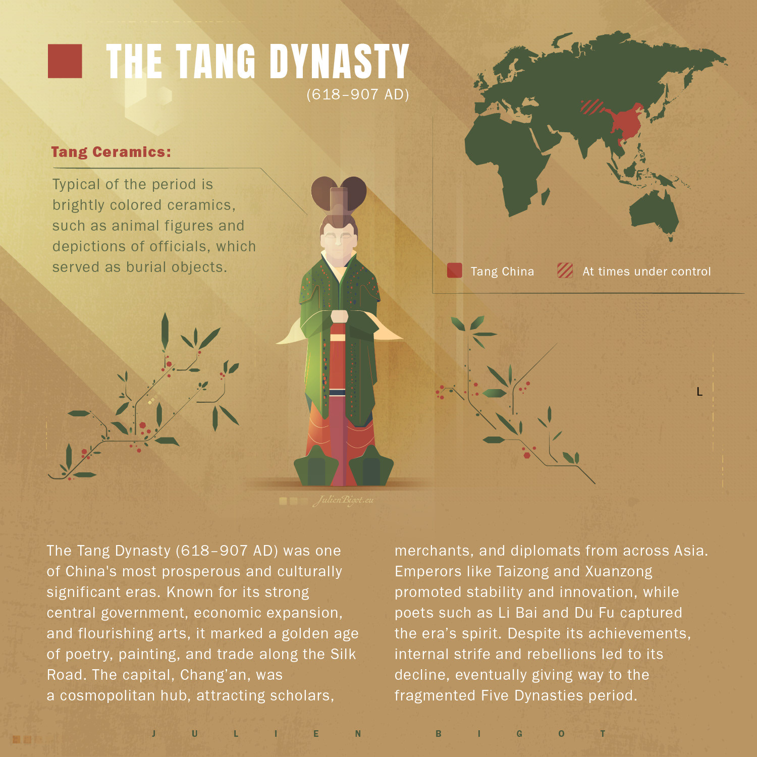 Educational infographic about the Tang Dynasty (618–907 AD), featuring a stylised Tang official statue, decorative plants, and a world map highlighting Tang China and its sphere of control. Short text blocks explain Tang ceramics, the dynasty’s prosperity, cultural achievements, and eventual decline.